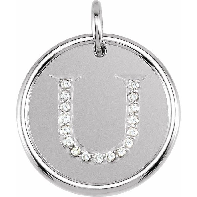 Round sterling silver initial U charm has genuine diamond accents. Charm dimensions: 17.25mm. The charm is set with 1mm, full cut G-H color I1 clarity genuine round diamonds. Weight: 2.6 grams.