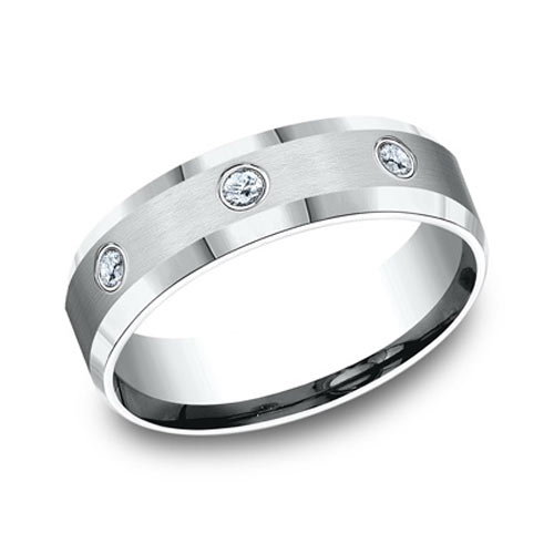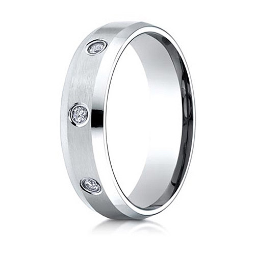 Platinum beveled wedding band has bezel set diamonds all the way around. 1/3 carat total weight. Die struck and heavy comfort fit. 8 x .04CT round brilliant diamonds. Diamond color G, clarity SI1. Diamonds are carefully matched and subject to stringent inspection. Precision-set. Satin finish. Width: 6mm. Solid platinum 950 [95% Platinum, 5% Ruthenium alloy]. Made in USA.The Perfection of Precision SettingOur process allows as much of the diamond's surface to be displayed while also providing superior security for the stones. Hand-set diamonds are often inconsistently secured and have an uneven surface. These bands are engineered for perfection. Our customers have come to expect the best, and we take pride in delivering it every day.