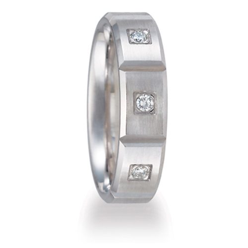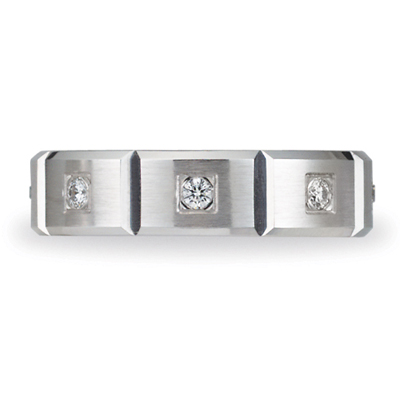 This men's diamond platinum wedding band has eight panels and diamonds. Ring width: 6mm. Polished edges and grooves, satin center. 8 x .04CT round brilliant diamonds. Diamond color G, clarity SI1. Precision-set diamonds are carefully matched and subject to stringent inspection. Die struck and comfort fit. Solid platinum 950 [95% Platinum, 5% Ruthenium alloy]. Made in USA.