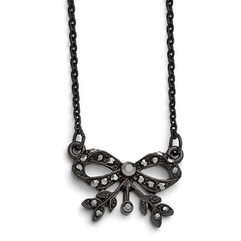 Buy a Downton Abbey black-plated bow necklace with black crystals. Weight: 5.62 grams. Dimensions: 1in x 3/4in. Fancy lobster clasp. Necklace length is adjustable from 16in to 19in. Officially licensed Downton Abbey merchandise. Includes Downton Abbey themed gift box. Nickel-free.
