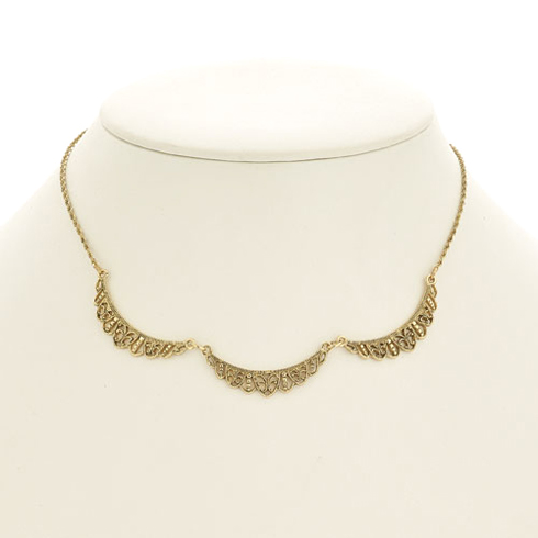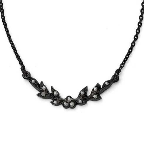 Downton Abbey black-plated leaf collar necklace features hematite Czech crystals. Weight: 5.5 grams. Pendant dimensions: 1 3/4in x 1/4in. Fancy lobster clasp. Necklace length is adjustable from 16in to 19in. Officially licensed Downton Abbey merchandise. Includes Downton Abbey themed gift box. Nickel-free. Made in USA.