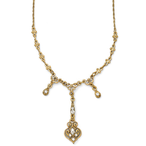 Gold-tone Downton Abbey glass crystal triple drop necklace features Edwardian style elements. Weight: 7.91 grams. Pendant dimensions: 1/2in x 1 3/4in. Officially licensed Downton Abbey merchandise. Includes Downton Abbey themed gift box. Nickel-free. Import.