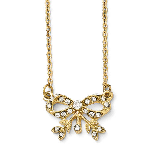 Buy gold-tone Downton Abbey Clear Crystal Bow Round Pendant Necklace. Pendant dimensions: 1in x 3/4in. Fancy lobster clasp. Necklace length is adjustable from 16in to 19in. Weight: 5.82 grams. Officially licensed Downton Abbey merchandise. Includes Downton Abbey themed gift box. Nickel-free. Import.