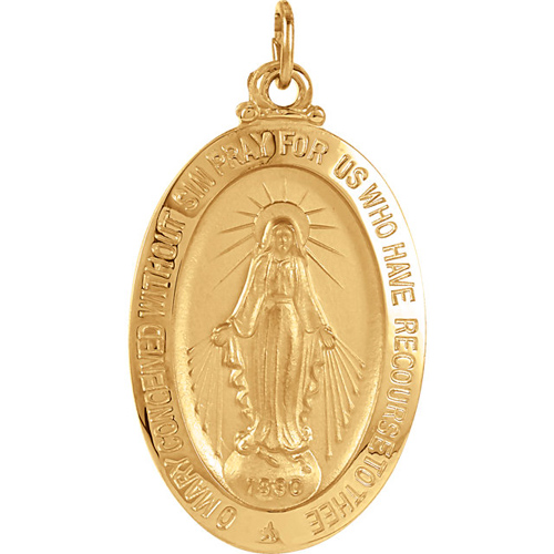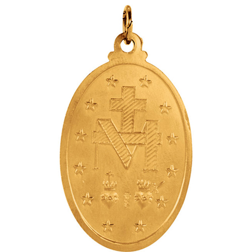 Solid 14k yellow gold oval miraculous medal is die struck and has a polished finish. Dimensions: 26.00mm by 18.00mm. This item is slightly larger than a quarter. Inscription: MARY CONCEIVED WITHOUT SIN PRAY FOR US WHO HAVE RECOURSE TO THEE. The back of medal features an M, surmounted by a cross, with 2 hearts and 12 stars. Weighs 3.59 grams. Chain not included.