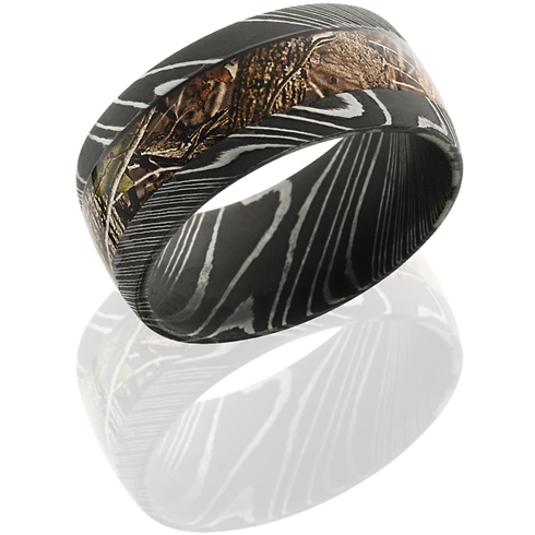 This Damascus steel ring features King's Woodland Shadow Camo inlay. Width: 10mm. This domed camouflage ring has polished edges. Deluxe comfort fit ring is handcrafted in the USA. Please use a narrow ring sizer when sizing your finger. Ring is available in finger sizes 6 to 16. This ring is officially licensed by King's Camo.