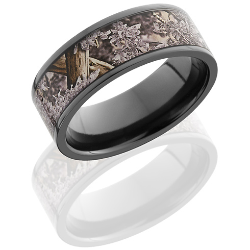 This flat black zirconium ring features King's Desert Shadow camo inlay. Width: 8mm. This camouflage ring has polished edges. Deluxe comfort fit ring is handcrafted in the USA. Please use a narrow ring sizer when sizing your finger. Ring is available in finger sizes 6 to 16. This ring is officially licensed by King's Camo.