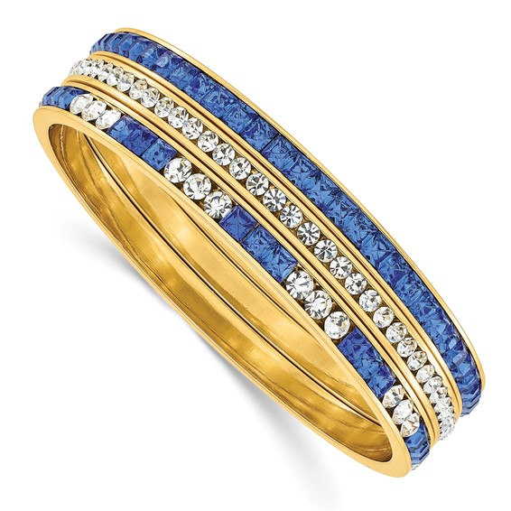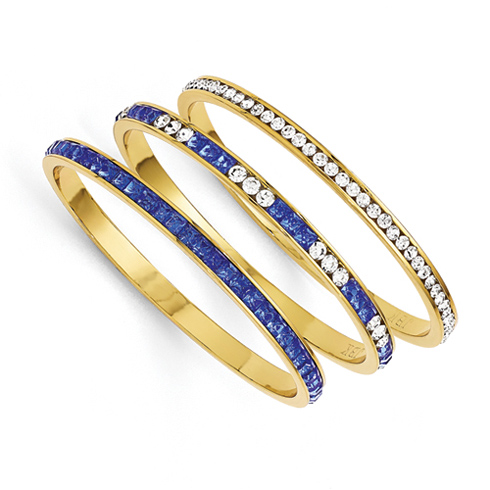 Jacqueline Kennedy 8in blue and white three piece bangle set is made of 18kt gold plated mixed metal. 174 blue and 209 clear Swarovski elements, slip-on. Part of the Jacqueline Kennedy collection. Each piece of Camrose & Kross jewelry is guaranteed for life against defects in workmanship.