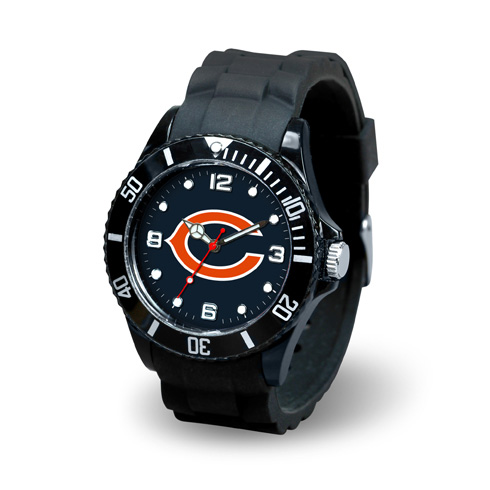 Chicago Bears Spirit watch features a round dial with team logo and ratcheting sport elasped time bezel. Case size: 33mm, Case thickness: 8mm, case lug size: 14mm. Supple silicon rubber strap with sports buckle. Strap length: 7in to 9in. Precision quartz movement. Includes free gift tin. Water and shock resistant to 3 ATM. Stainless steel caseback. Acrylic crystal lens and team color bezel. Silver time and fluorecent hands. Limited lifetime warranty.