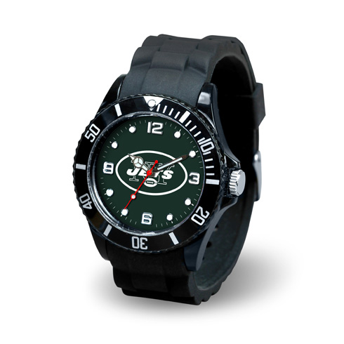 New York Jets Spirit watch features a round dial with team logo and ratcheting sport elasped time bezel. Case size: 33mm, Case thickness: 8mm, case lug size: 14mm. Supple silicon rubber strap with sports buckle. Strap length: 7in to 9in. Precision quartz movement. Includes free gift tin. Water and shock resistant to 3 ATM. Stainless steel caseback. Acrylic crystal lens and team color bezel. Silver time and fluorecent hands. Limited lifetime warranty.