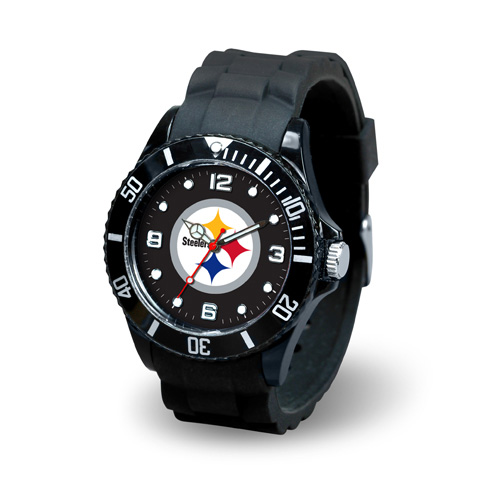 Pittsburgh Steelers spirit watch has a round dial with team logo and ratcheting sport elasped time bezel. Case size: 33mm, Case thickness: 8mm, case lug size: 14mm. Black supple silicon rubber strap with sports buckle. Strap length: 7in to 9in. Precision quartz movement. Includes free gift tin. Water and shock resistant to 3 ATM. Stainless steel caseback. Acrylic crystal lens and team color bezel. Silver time and fluorecent hands. Limited lifetime warranty.