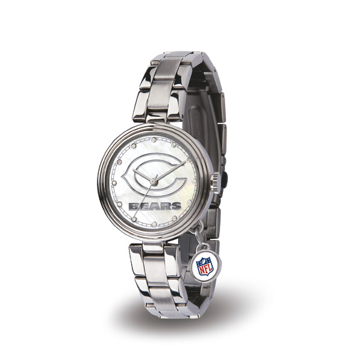 Chicago Bears Charm features a round Mother of pearl dial with team logo. Case size: 35mm, Case thickness: 6mm, case lug size: 16mm. Stainless steel bracelet. Strap length: 7 1/2in. Citizen Precision quartz movement. Includes free gift tin. Water and shock resistant to 3 ATM. Stainless steel caseback. Scratch resistant mineral crystal lens and applied crystal hour markers. Limited lifetime warranty.