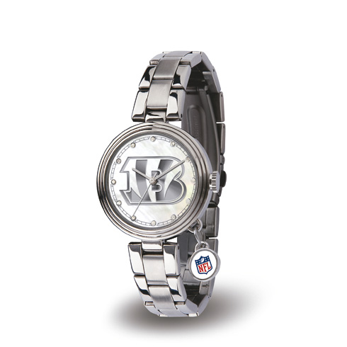 Cincinnati Bengals Charm watch features a round Mother of pearl dial with team logo. Case size: 35mm, Case thickness: 6mm, case lug size: 16mm. Stainless steel bracelet. Strap length: 7 1/2in. Citizen Precision quartz movement. Includes free gift tin. Water and shock resistant to 3 ATM. Stainless steel caseback. Scratch resistant mineral crystal lens and applied crystal hour markers. Limited lifetime warranty.