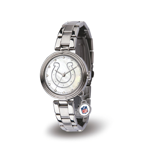 Indianapolis Colts Charm watch features a round Mother of pearl dial with team logo. Case size: 35mm, Case thickness: 6mm, case lug size: 16mm. Stainless steel bracelet. Strap length: 7 1/2in. Citizen Precision quartz movement. Includes free gift tin. Water and shock resistant to 3 ATM. Stainless steel caseback. Scratch resistant mineral crystal lens and applied crystal hour markers. Limited lifetime warranty.
