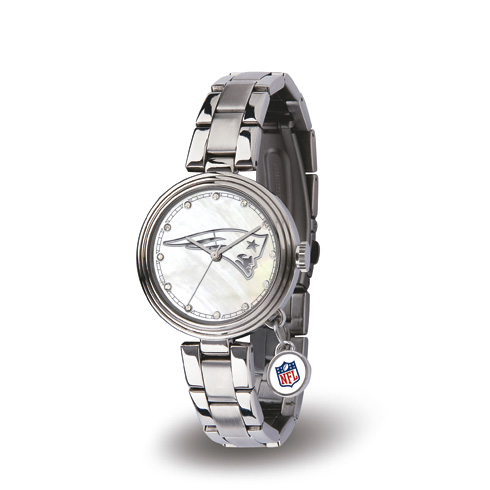 The ladies' New England Patriots charm watch features a round mother of pearl dial with team logo. Case size: 35mm, Case thickness: 6mm, case lug size: 16mm. Stainless steel bracelet. Strap length: 7 1/2in. Citizen Precision quartz movement. Includes free gift tin. Water and shock resistant to 3 ATM. Stainless steel caseback. Scratch resistant mineral crystal lens and applied crystal hour markers. Limited lifetime warranty.