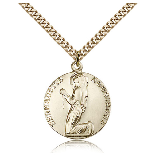 This round gold filled sterling silver Saint Bernadette medal is die struck, hand-engraved. Inscription: BERNADETTE SOUBIROUS. 24-inch stainless steel, endless heavy curb chain with gold plating. Dimensions: 1in x 7/8in. This item is the size of a quarter. Made in USA.