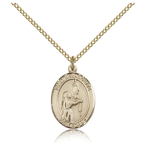 Gold filled oval St Bernadette medal includes a gold-plated sterling silver 18 inch lite curb chain with lobster clasp. Dimensions: 3/4in x 1/2in. This item is the size of a penny. Die struck, hand-engraved. Inscription: SAINT BERNADETTE PRAY FOR US. Made in USA.