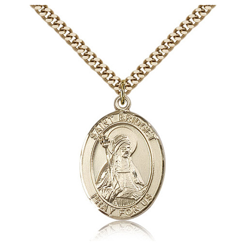 Gold filled sterling silver oval St Bridget medal dangles from a 24-inch stainless steel, endless heavy curb chain with gold plating. Inscription: SAINT BRIDGET PRAY FOR US. Dimensions: 1in x 3/4in. This item is the size of a quarter. Made in USA.