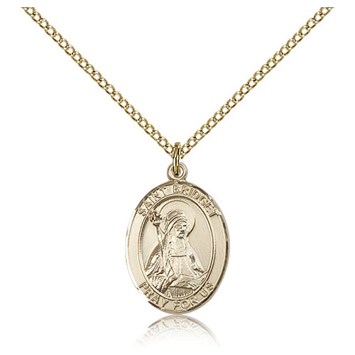 Gold filled St Bridge medal dangles from a 18-inch gold-plated sterling silver lite curb chain with lobster clasp. Inscription: SAINT BRIDGET PRAY FOR US. 18-inch gold-plated sterling silver lite curb chain with lobster clasp. Dimensions: 3/4in x 1/2in. This item is the size of a penny. Made in USA.
