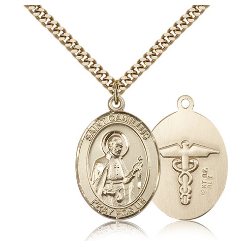 Gold filled oval St Camillus nurse medal dangles from a 24-inch stainless steel, endless heavy curb chain with gold plating. Reverse side features a caduceus symbol. Dimensions: 1in x 3/4in. This item is the size of a quarter. Die struck, hand-engraved medal. Inscription: SAINT CAMILLUS PRAY FOR US. Made in USA.