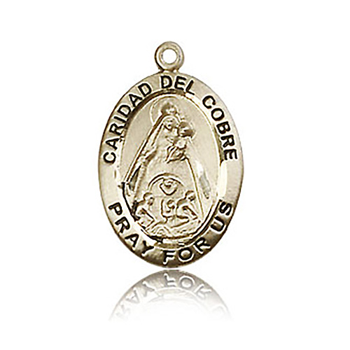 Die struck, hand-engraved caridad del cobre medal is made of polished, solid 14k yellow gold. Inscription: CARIDAD DEL COBRE PRAY FOR US. Dimensions: 3/4in x 1/2in. This item is the size of a penny. Made in USA.
