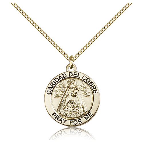 Die struck, hand-engraved medal. Inscription: CARIDAD DEL COBRE PRAY FOR ME. Free 18-inch sterling silver lite curb chain with lobster clasp and gold plating. Dimensions: 7/8in x 7/8in. This item is the size of a nickel. Made in USA.