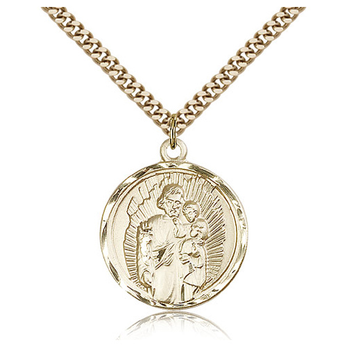 This round Saint Joseph medal is made of gold-filled sterling silver. 24-inch stainless steel, endless heavy curb chain with gold plating. Dimensions: 1in x 7/8in. Die struck and hand engraved. Made in USA.
