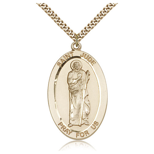 This large oval gold filled sterling silver St Jude medal is die struck and hand engraved. Inscription: SAINT JUDE PRAY FOR US. 24-inch stainless steel, endless heavy curb chain with gold plating. Dimensions: 1 5/8in x 1in. This item is the size of a half dollar. Made in USA.