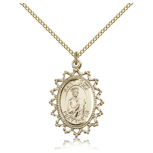Gold filled sterling silver St Jude medal has a fancy border. Inscription: SAINT JUDE PRAY FOR US. 18-inch sterling silver lite curb chain with lobster clasp and gold plating. Dimensions: 1in x 3/4in. This item is the size of a quarter. Made in USA.