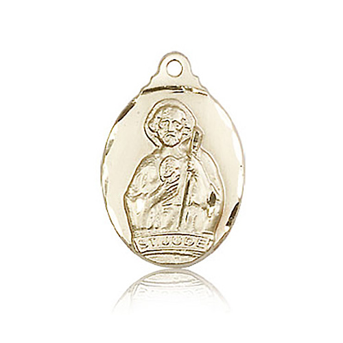 Die struck, hand-engraved medal is made of polished, solid 14kt yellow gold. Inscription: ST JUDE. Dimensions: 7/8in x 1/2in. This item is the size of a nickel. Made in USA.