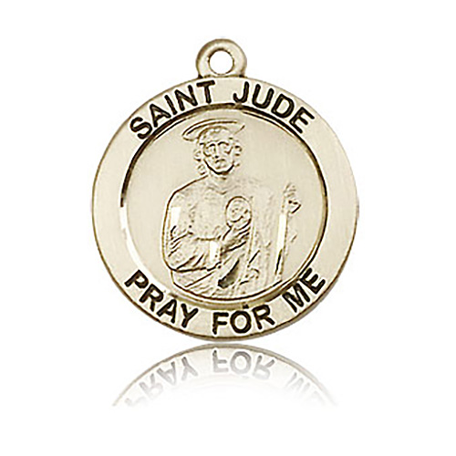 Die struck, hand-engraved round St Jude medal is made of polished, solid 14kt yellow gold. Inscription: SAINT JUDE PRAY FOR ME. Dimensions: 3/4in x 3/4in. This item is the size of a penny. Made in USA.
