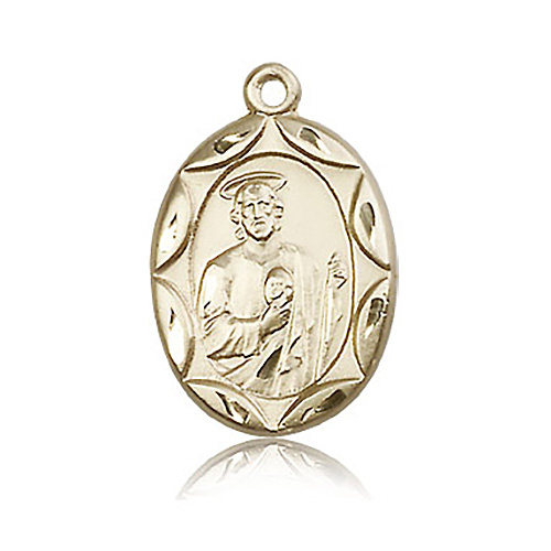 St Jude medal with scalloped edge is made of polished, solid 14k yellow gold. Dimensions: 1in x 5/8in. This item is the size of a quarter. Made in USA.