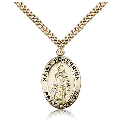 Die struck, hand-engraved oval St Peregrine medal is made of gold filled sterling silver. Dimensions: 1in x 5/8in. Inscription: SAINT PEREGRINE PRAY FOR US. 24-inch stainless steel, endless heavy curb chain with gold plating. This item is the size of a quarter. Made in USA.
