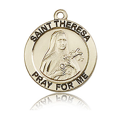 Die struck, hand-engraved medal is made of polished, solid 14kt yellow gold. Inscription: SAINT THERESA PRAY FOR ME. Dimensions: 3/4in x 3/4in. This item is the size of a penny. Made in USA.