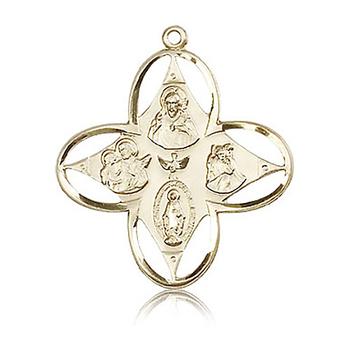 This large die struck, hand-engraved four way medal is made of polished, solid 14k yellow gold. Dimensions: 1 1/4in x 1 1/8in. This item is larger than a quarter. Made in USA.