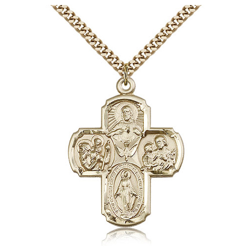 This large die struck, hand-engraved five way medal is made of gold plated sterling silver. 24-inch stainless steel, endless heavy curb chain with gold plating. Dimensions: 1 3/8in x 1in. This item is larger than a quarter. Made in USA.