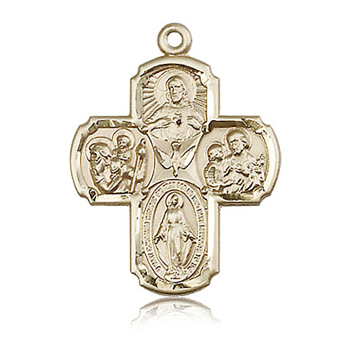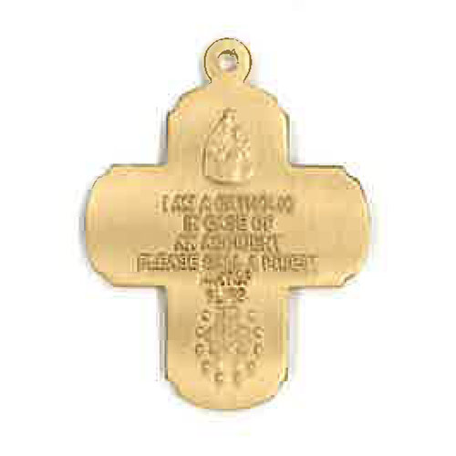 This large die struck, hand-engraved five way medal is made of polished, solid 14kt yellow gold. Dimensions: 1 3/8in x 1in. This item is larger than a quarter. Engraving on back: I am a Catholic in case of an accident call a priest. Made in USA.