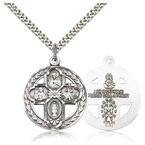 This large round four way medal is made of sterling silver. 24-inch stainless steel, endless heavy curb chain with silver plating. Medal size: 1 1/8in x 1 1/8in. This item is larger than a quarter. Die struck, hand-engraved four way medal. Made in USA.