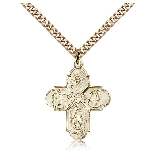 This die struck, hand-engraved four way medal is made of gold plated sterling silver. Dimensions: 7/8in x 1in. This item is the size of a quarter. The medal dangles from a 24-inch stainless steel, endless heavy curb chain with gold plating. Made in USA.