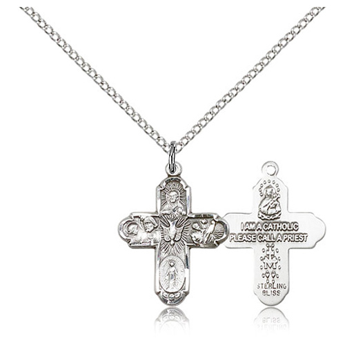 This ladies' sterling silver five way medal dangles from a sterling silver 18-inch lite curb chain with lobster clasp. Dimensions: 3/4in x 5/8in. This item is the size of a penny. Die struck, hand-engraved five way medal is Made in USA.