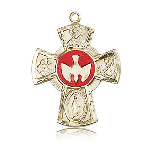 This 14k yellow gold die struck five way medal is decorated with red enamel. Dimensions: 7/8in x 1 1/8in. This item is slightly larger than a quarter. The back of the medal is engraved with the words: I AM A CATHOLIC PLEASE CALL A PRIEST. Made in USA.