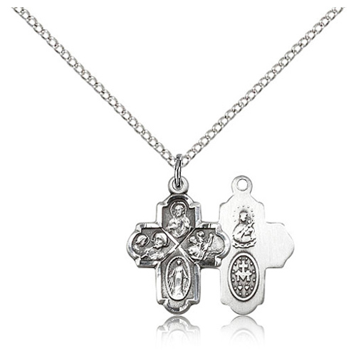 Die struck, hand-engraved four way medal is made of sterling silver. Dimensions: 3/4in x 1/2in. 18-inch sterling silver lite curb chain with lobster clasp. This medal is the size of a penny. Made in USA.