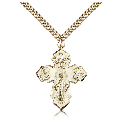 This die struck, hand-engraved four way medal is made of gold plated sterling silver. Free 24-inch stainless steel, endless heavy curb chain with gold plating. Engraved on reverse: COME HOLY GHOST ENLIGHTEN. Dimensions: 7/8in x 1 1/4in. This item is slightly larger than a quarter. Made in USA.