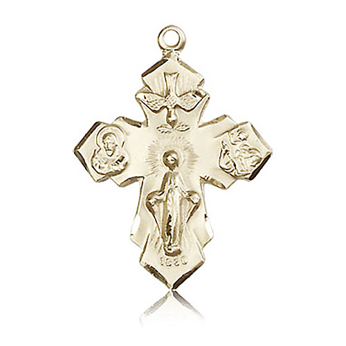 This die struck, hand-engraved four way medal is made of polished, solid 14kt yellow gold. Engraved on reverse: COME HOLY GHOST ENLIGHTEN. Dimensions: 7/8in x 1 1/4in. This item is slightly larger than a quarter. Made in USA.