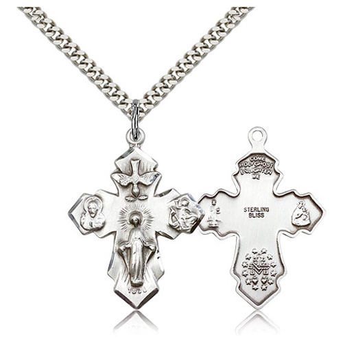 Sterling silver four way medal has pointed tips. 24-inch stainless steel, endless heavy curb chain with silver plating. Engraved on reverse: COME HOLY GHOST ENLIGHTEN. Dimensions: 7/8in x 1 1/4in. This item is slightly larger than a quarter. Die struck, hand-engraved. Made in USA.