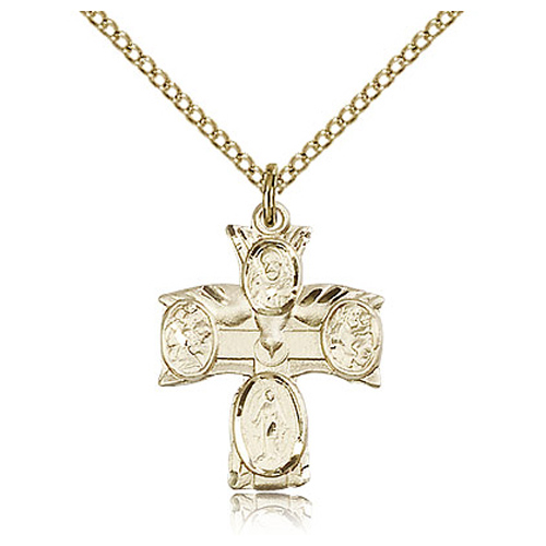 This four way medal with large dove is made of gold plated sterling silver. 18-inch gold-plated sterling silver lite curb chain with lobster clasp. Dimensions: 3/4in x 5/8in. This item is the size of a penny. Made in USA.