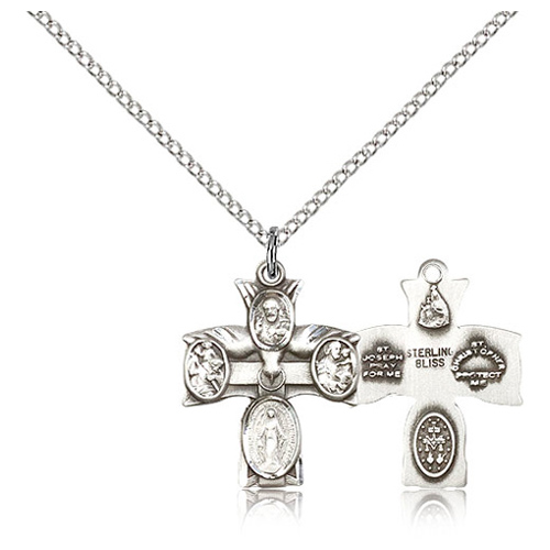 Sterling silver four way medal with holy spirit dangles from an 18-inch sterling silver lite curb chain with lobster clasp. Dimensions: 3/4in x 5/8in. This item is the size of a penny. Made in USA. Die struck, hand-engraved.