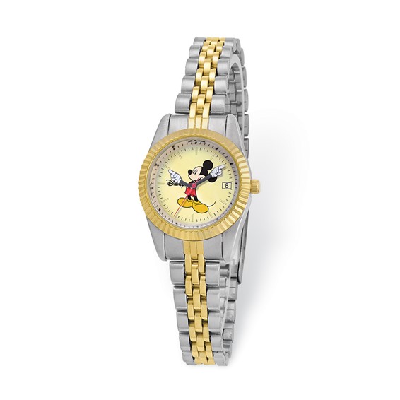 This Disney two-tone gold dial moving arms Mickey Mouse Watch is officially licensed. Details: 1 year limited warranty. 26mm. 3 atm water resistance. Alloy case. Character / design dial. Date. Gold-tone dial. Gold-tone markers. Mineral crystal. Push button deployment. Quartz movement. Stainless steel caseback. Two-tone. Imported.