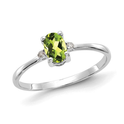 This oval peridot and diamond ring is made of polished solid 14k white gold. Gemstone details: one 1/2 ct tw genuine oval peridot and .01 ct tw diamond accents. Peridot dimensions: 6mm x 4mm. Medium color; eye clean; good cut. Approximate item weight: .9 grams. Import.