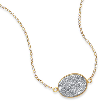 Oval silver druzy stone dangles from a 16in gold filled chain with 1in extension. Stone dimensions: 17mm x 13mm. This item is 14/20 gold filled: 1/20 of 14kt yellow gold with relation to the brass core. This gives the item the look and feel of gold jewelry, at a much more affordable price. Gold filled jewelry has about 100 times more gold than gold-plated jewelry, so the gold surface will never flake, peel, or wear off. Imported.