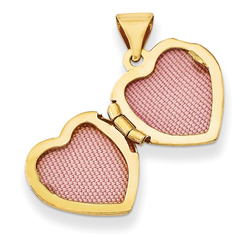 This tiny 14k yellow gold heart shaped locket has scroll design edges. This polished locket holds two photos. Dimensions: 10mm x 10mm. This item is much smaller than a dime. Weight: 0.35 grams. Import.
